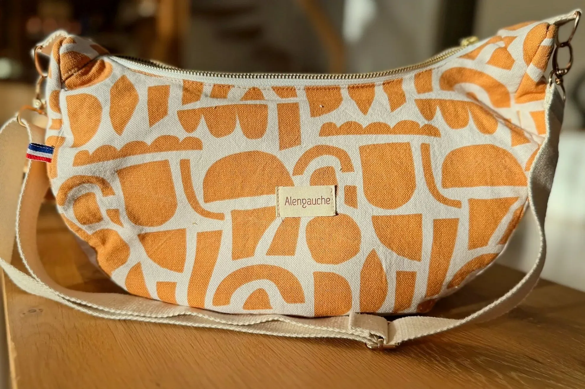 Ambre est un sac demi-lune grand modèle en jacquard aux motifs graphiques terracotta et beige. Chaleureux et lumineux, il associe un intérieur écru doux à des finitions dorées élégantes pour un style affirmé et solaire.
