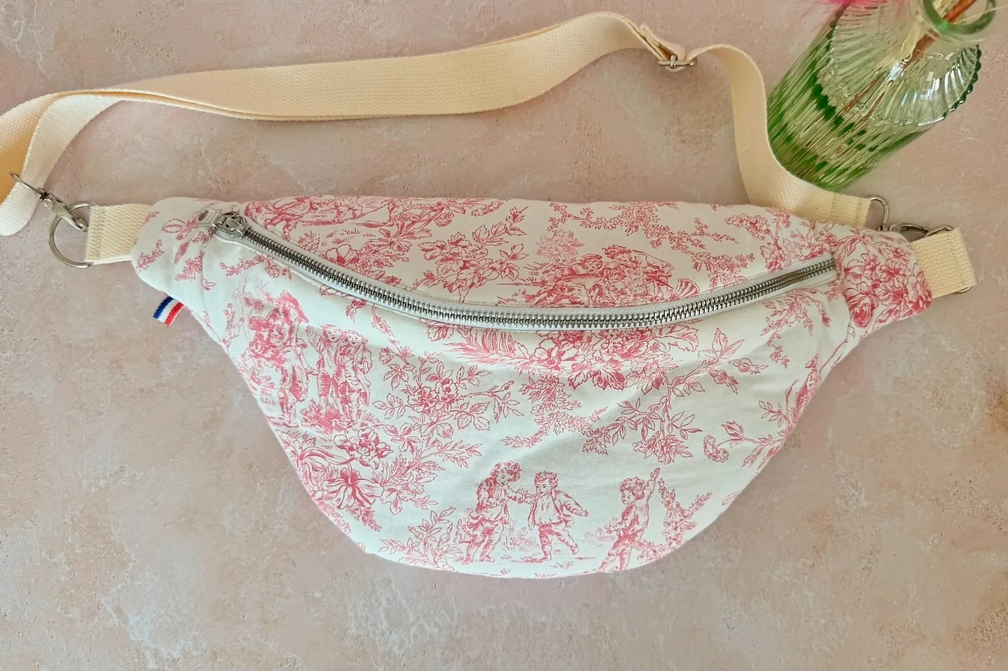 Sac banane artisanal pour femme en toile de Jouy rose et blanc, Apolline est une pièce unique au style romantique, doux et intemporel, idéale pour apporter une touche raffinée au quotidien.
