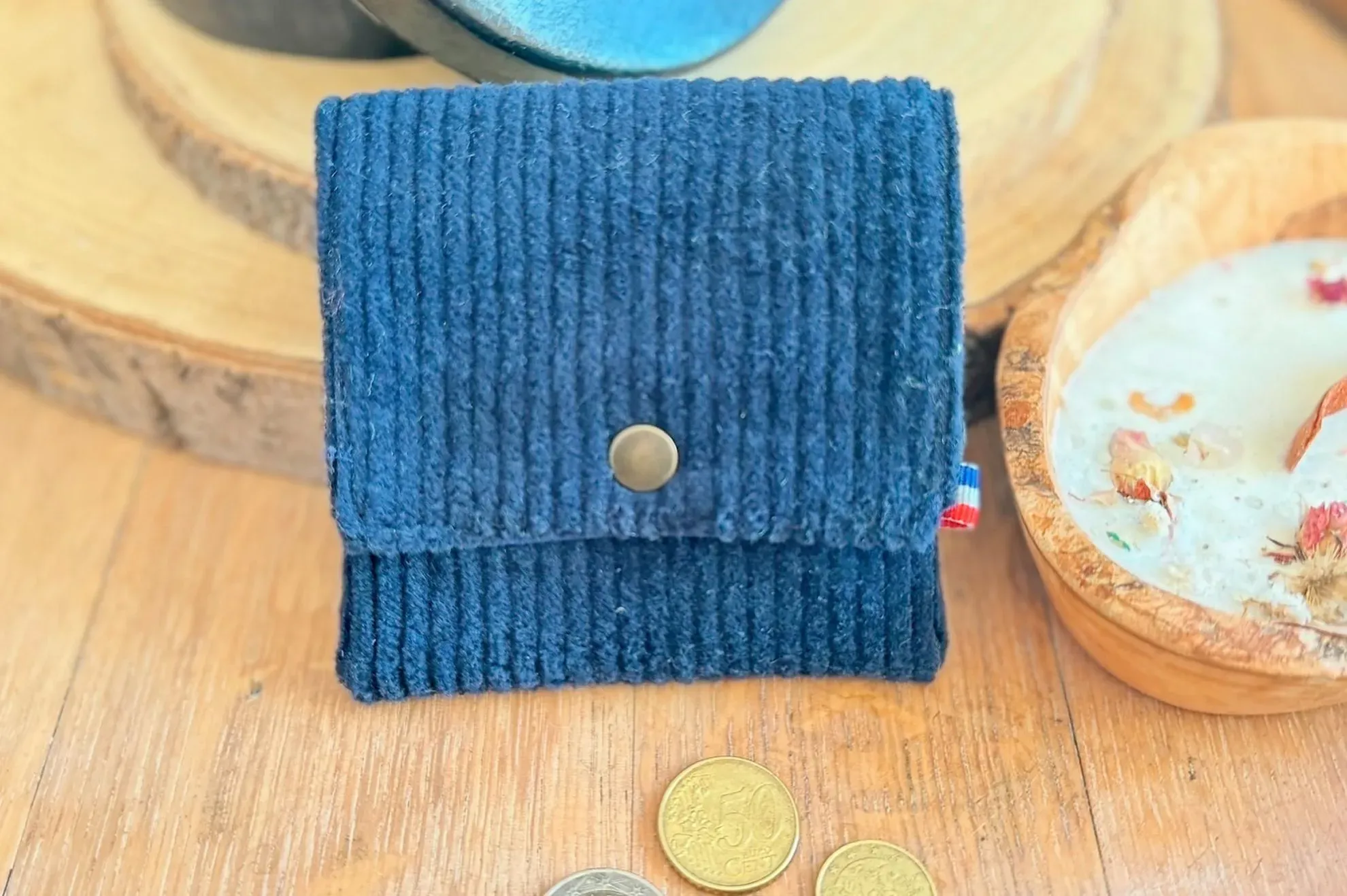 Porte-monnaie compact et fonctionnel en velours côtelé marine, avec un intérieur en coton uni marine. Sobre et intemporel, il dispose de plusieurs compartiments pour cartes, monnaie et billets, idéal pour un usage quotidien, au style mixte.