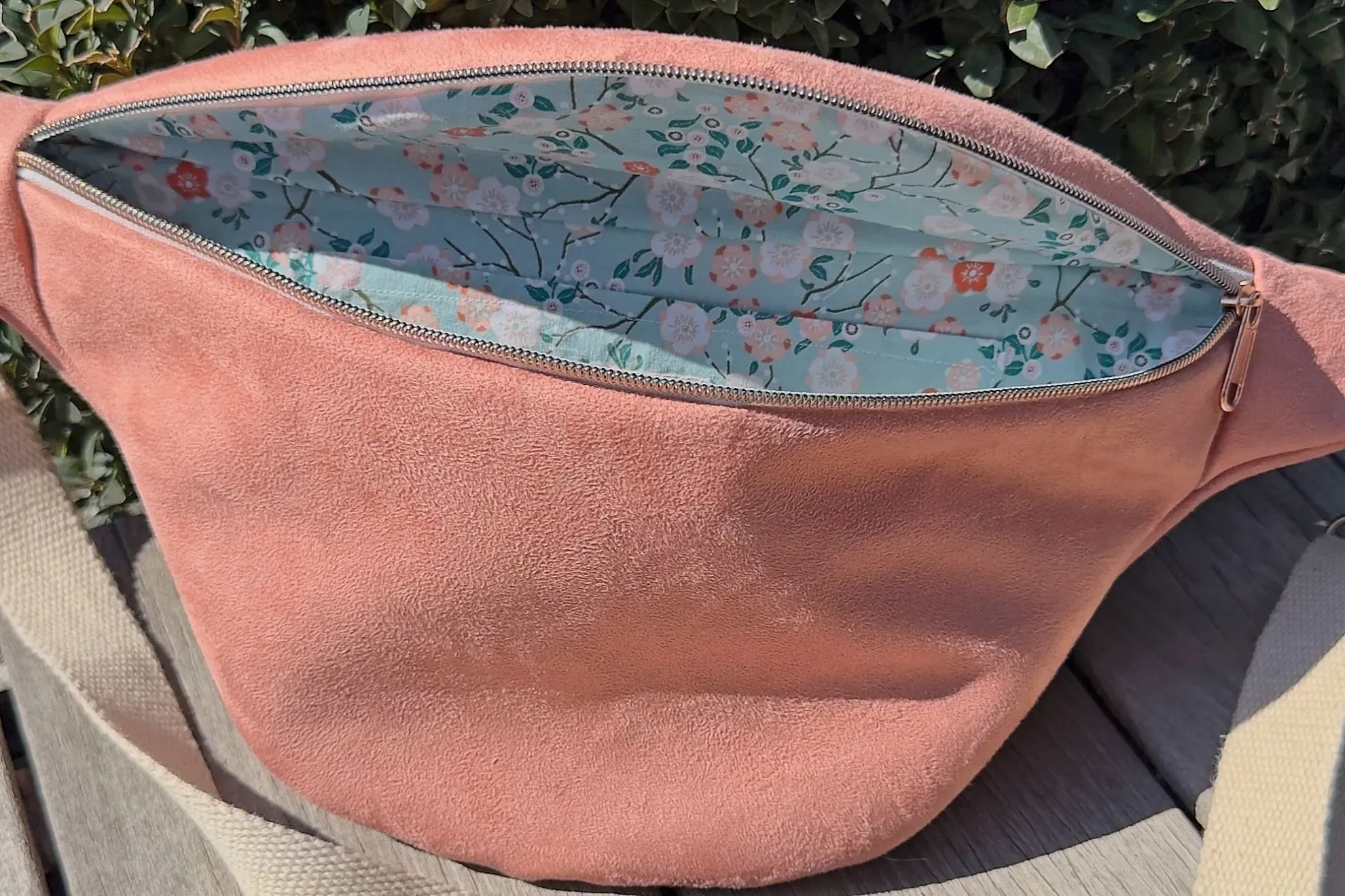 • Matière : suédine rose, doublure coton turquoise à motifs sakura