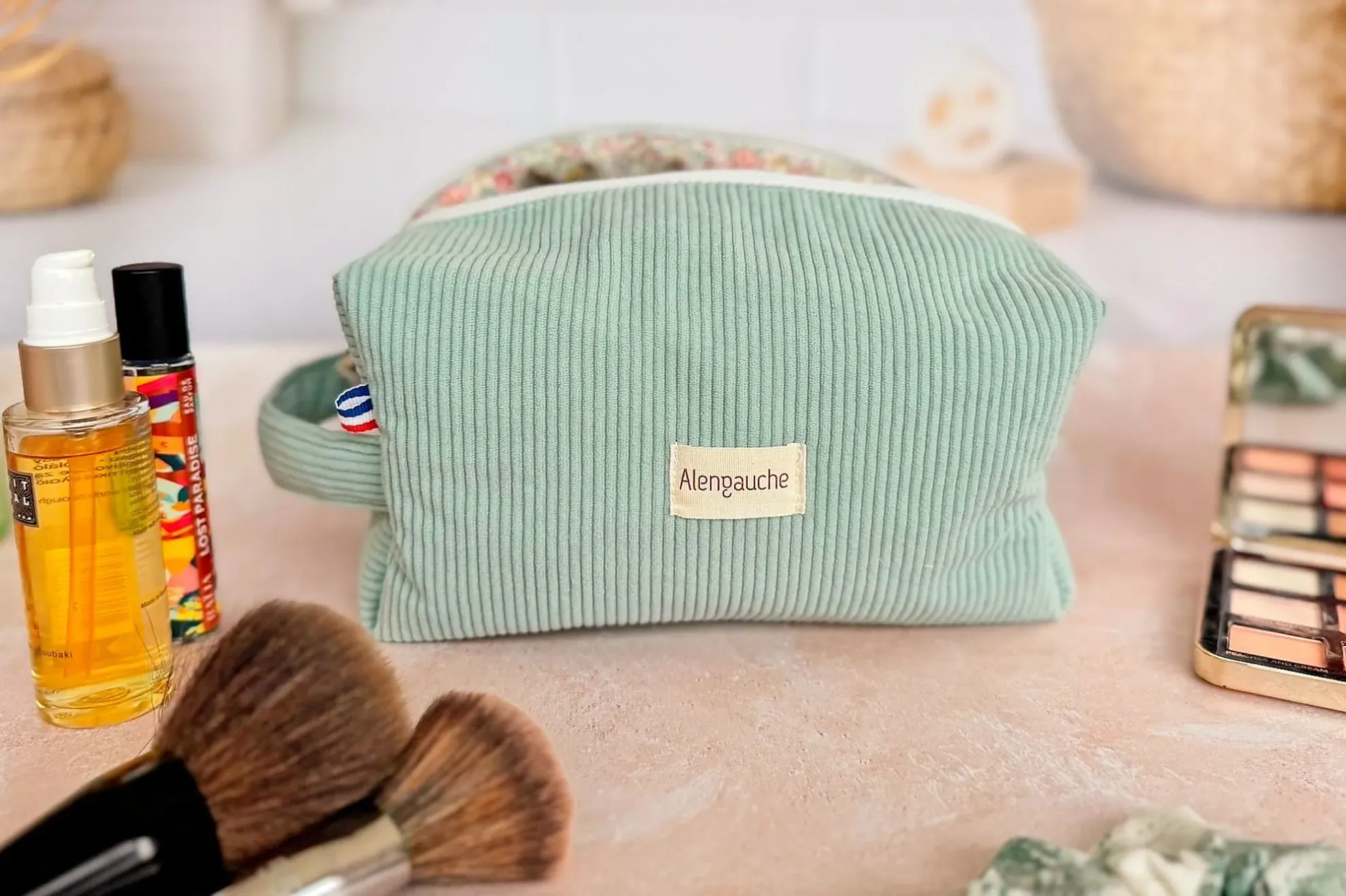 La trousse de toilette Jade est une création artisanale cousue à la main dans mon atelier à Vence. Réalisée en velours côtelé vert sauge, elle est idéale pour ranger maquillage et produits de soin avec une touche naturelle et élégante.