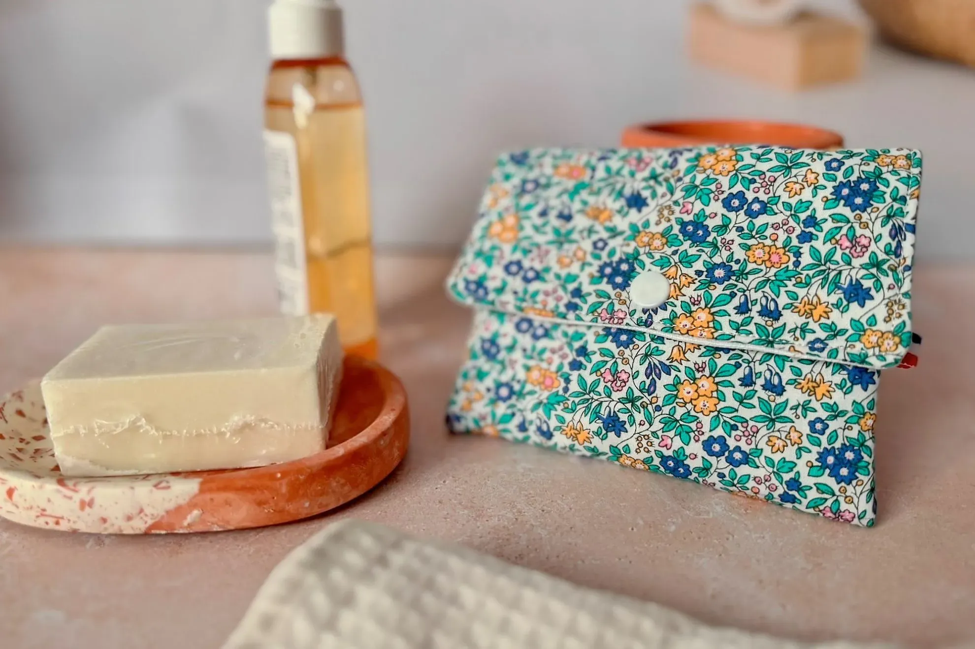 Pochette à savon imperméable en tissu liberty bleu, idéale pour transporter un savon ou un shampoing solide. Doublure intérieure imperméable, bouton pression en résine et format pratique pour le voyage.
