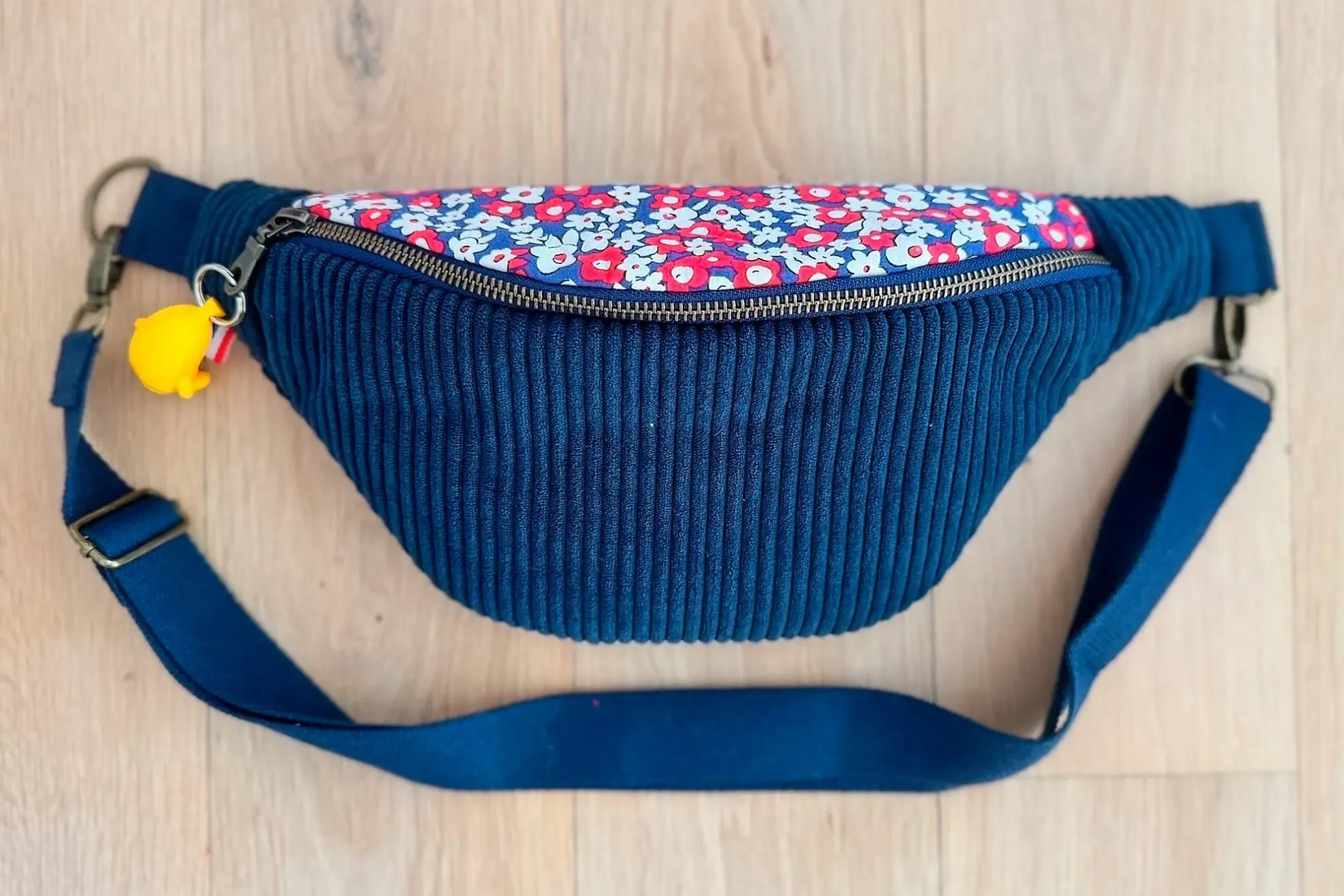 Coton fleuri rouge et bleu, velours côtelé marine et finitions bronze : Lily est une petite banane mixée fraîche et girly, pensée pour celles qui aiment les accessoires joyeux et sans prise de tête.