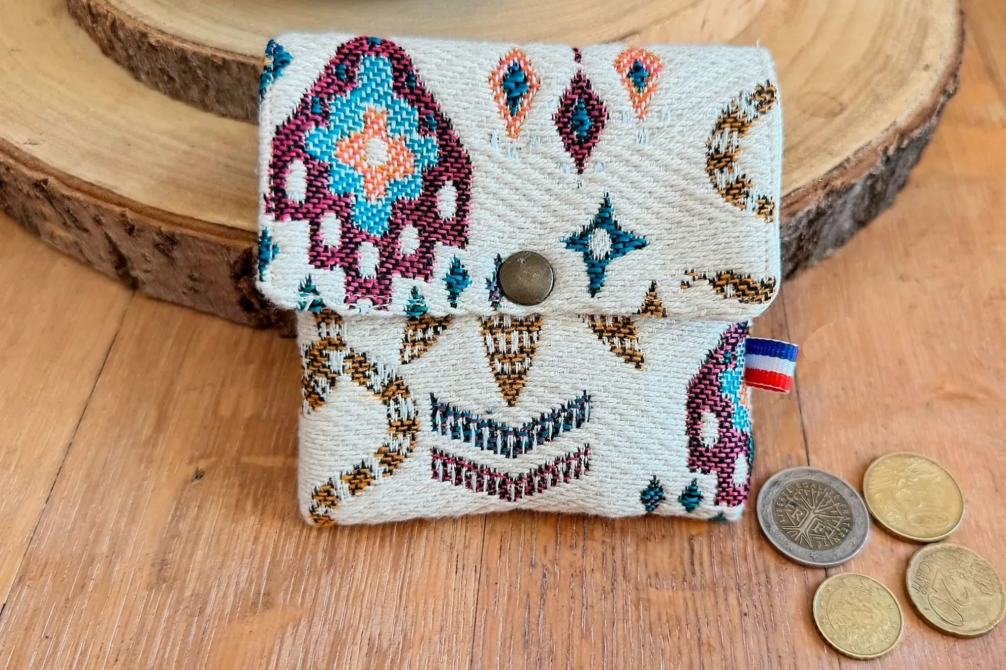 Porte-monnaie compact et fonctionnel en jacquard à motifs aztèques / tibétains, avec un intérieur uni écru. Il dispose de plusieurs compartiments pour cartes, monnaie et billets, idéal pour un usage quotidien.