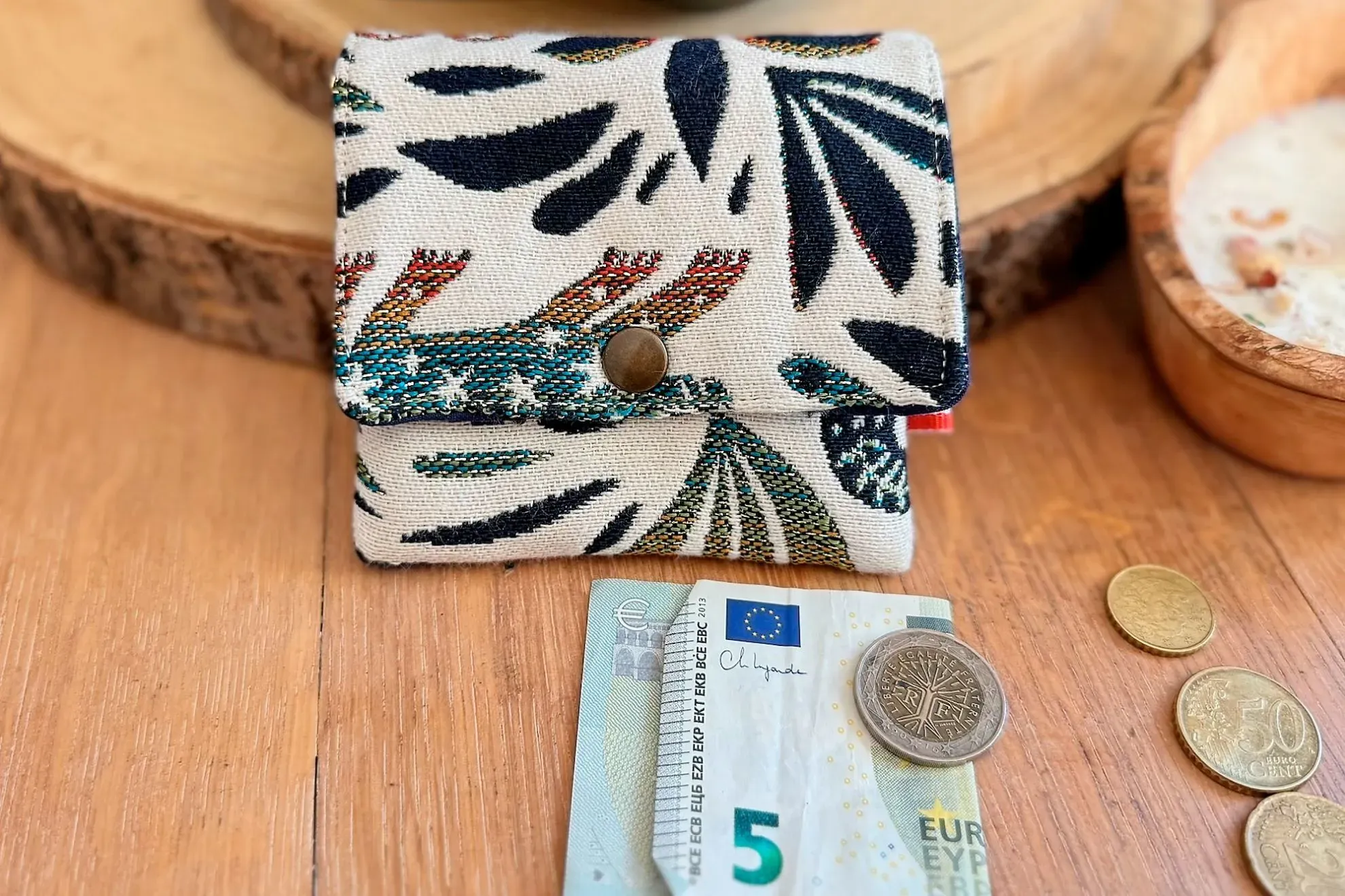 Porte-monnaie compact et fonctionnel en jacquard à motifs mystiques, avec un intérieur marine uni. Il dispose de plusieurs compartiments pour cartes, monnaie et billets, idéal pour un usage quotidien.