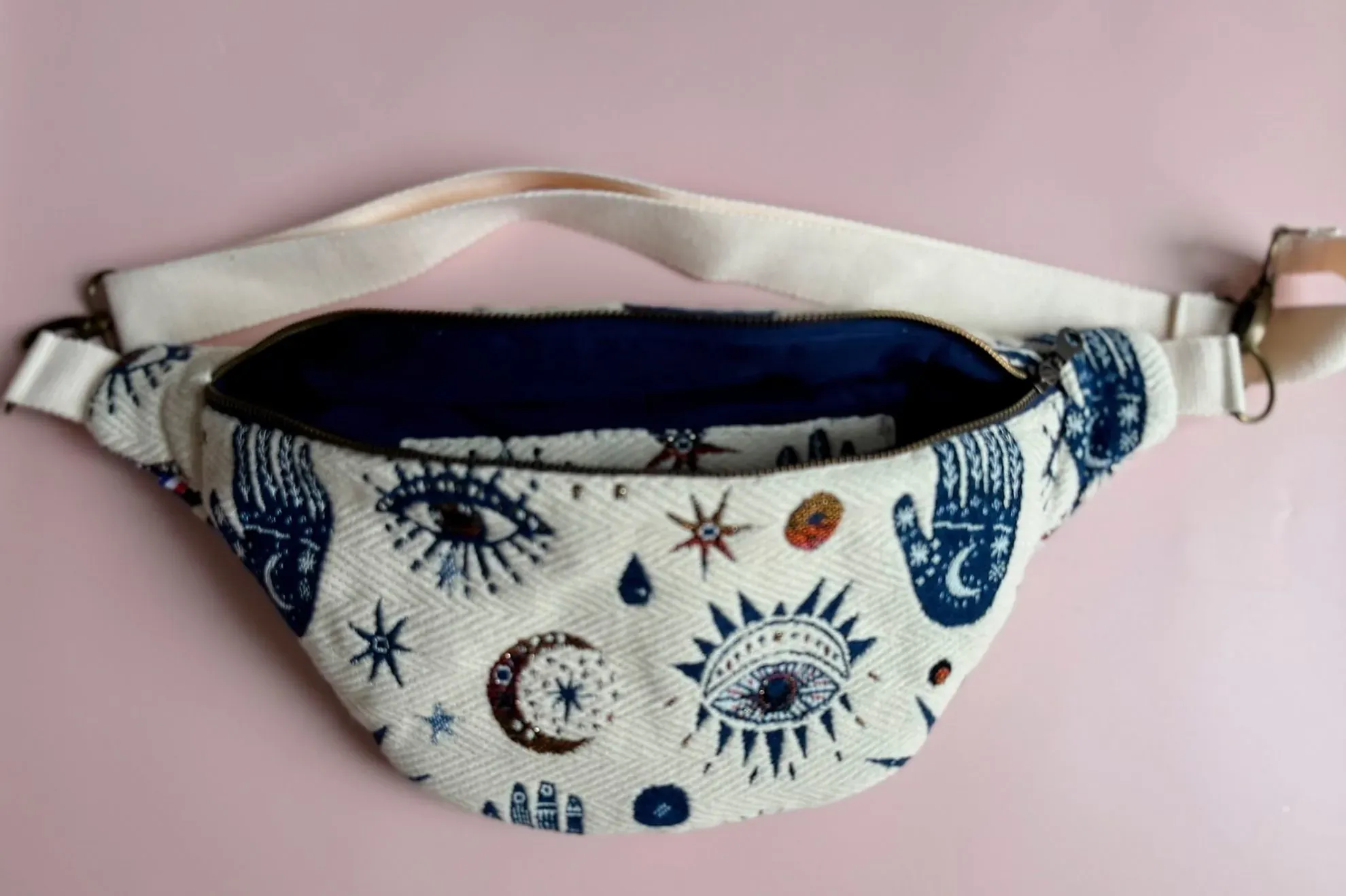 Namasté est une banane grand modèle en jacquard aux motifs mystiques bleus, sublimée par un intérieur bleu profond et des finitions bronze chaleureuses. Élégante et spirituelle, elle apporte profondeur et sérénité à vos tenues tout en offrant un format pratique pour le quotidien.