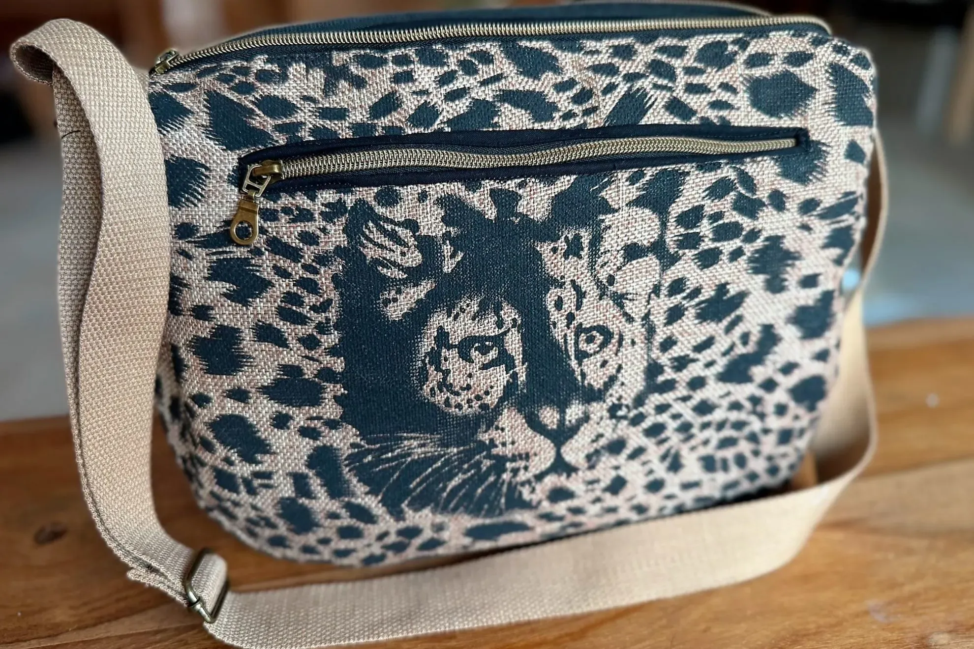 Naya attire immédiatement le regard avec son imprimé léopard puissant et graphique. La texture brute de la toile de jute contraste avec l’intensité du motif, créant une pièce forte et singulière.