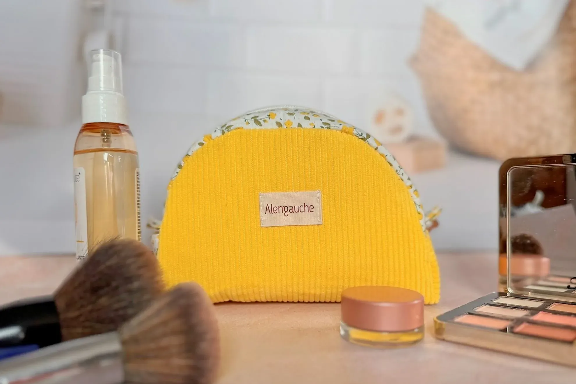 La trousse demi-lune Soleil est une création artisanale cousue à la main dans mon atelier à Vence. Réalisée en velours côtelé jaune avec une doublure en coton liberty jaune et une fermeture éclair décorée d’une tirette en forme de fleur, elle est idéale pour ranger maquillage et petits essentiels du quotidien avec une touche lumineuse et délicate. La trousse demi-lune Soleil est une création artisanale cousue à la main dans mon atelier à Vence. Réalisée en velours côtelé jaune avec une doublure en coton liberty jaune et une fermeture éclair décorée d’une tirette en forme de fleur, elle est idéale pour ranger maquillage et petits essentiels du quotidien avec une touche lumineuse et délicate.
