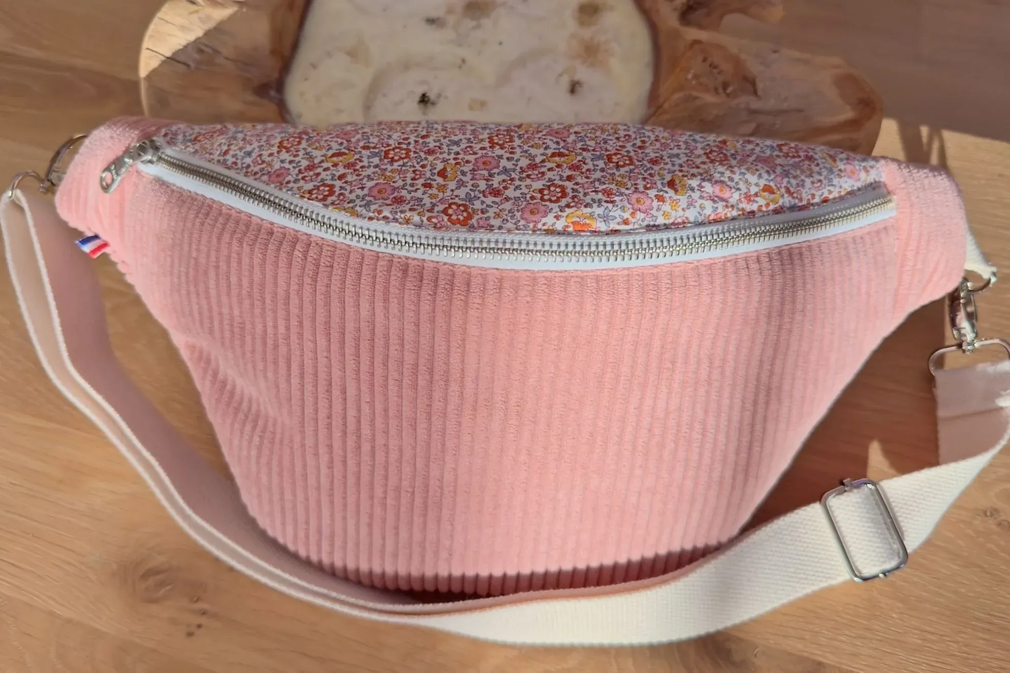 Rosalie est une banane douce et féminine, mêlant velours côtelé rose poudré et liberty rose pour une allure délicate et lumineuse. Une pièce artisanale pensée pour accompagner le quotidien avec tendresse et élégance.