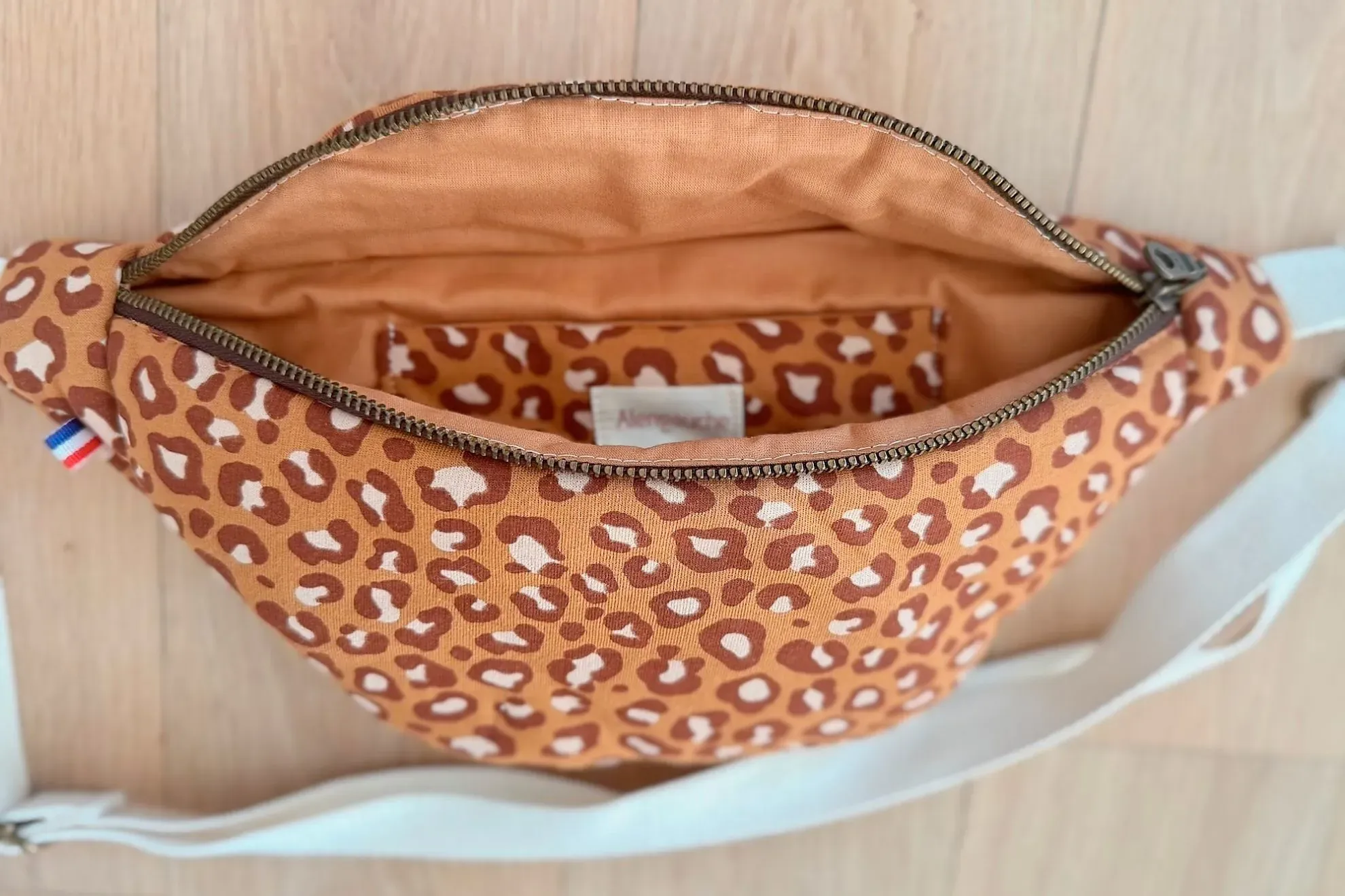 Jersey léopard aux tons marron orangé, intérieur camel et détails bronze : Nala est une banane petit format au style chaleureux et naturel, pensée pour celles qui aiment l’élégance sauvage au quotidien.