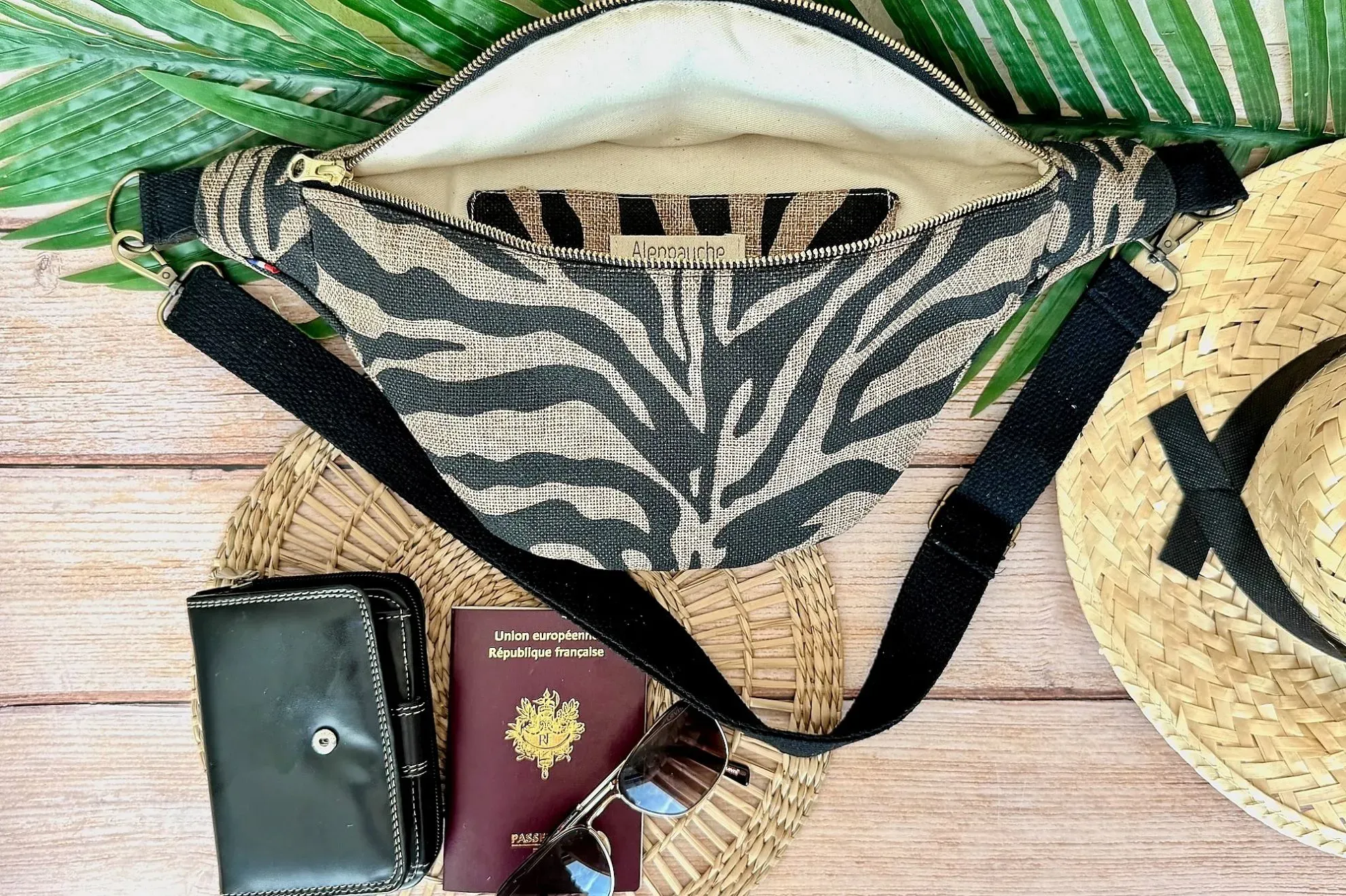 • Matière extérieure: toile de jute imprimée zébrée / Intérieure : Coton beige